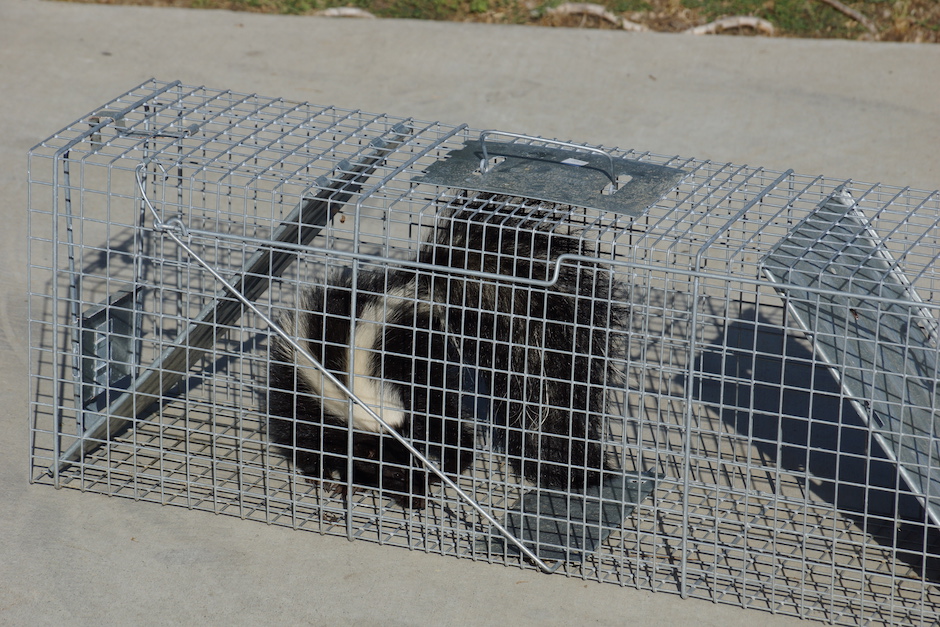 A spring loaded trap is used with different materials. Your aim is to lure the skunk inside the trap and then make sure the door is shut behind them once they are inside. The skunk can survive in the cage for a few days but to avoid stress to the animal it is best to relocate or drop off to the wildlife rescue place as soon as possible.